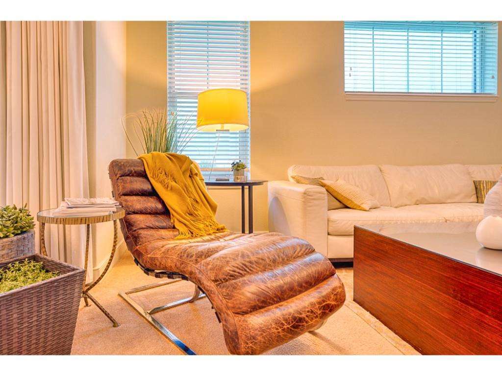 ~ Living Room: Leather sectional sofa, chaise lounge, and accent chair arranged around a large Smart TV. A desk and chair are also available for remote work.