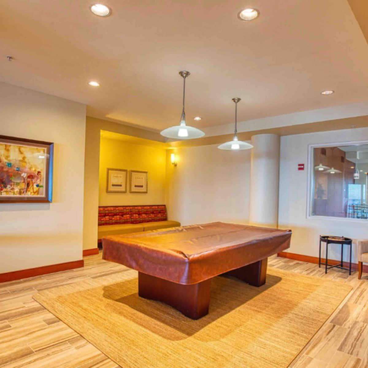 ~ Large community lounge with seating, flatscreen TV, and pool table