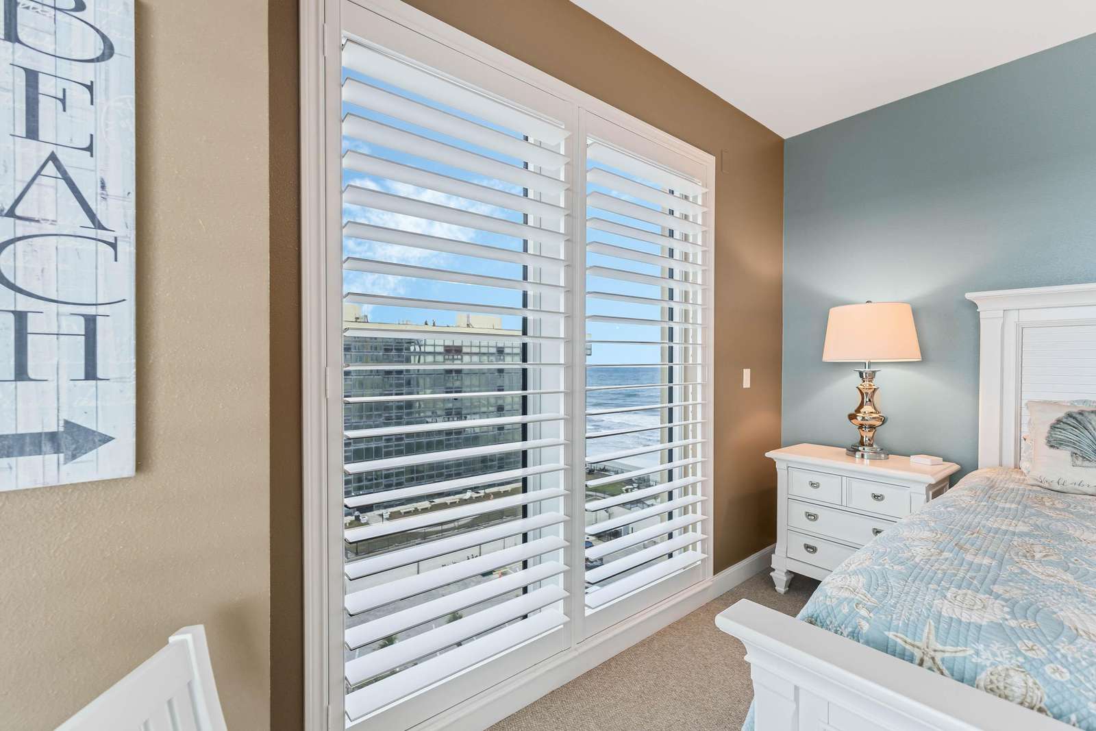 Bedroom #2 straight in the back is the second master suite with a king size bed, double closets, dresser, smart tv, private bath with a walk in shower, and large windows with plantation shutters that allow a beautiful view of the river with a sunset backdrop in the evening.