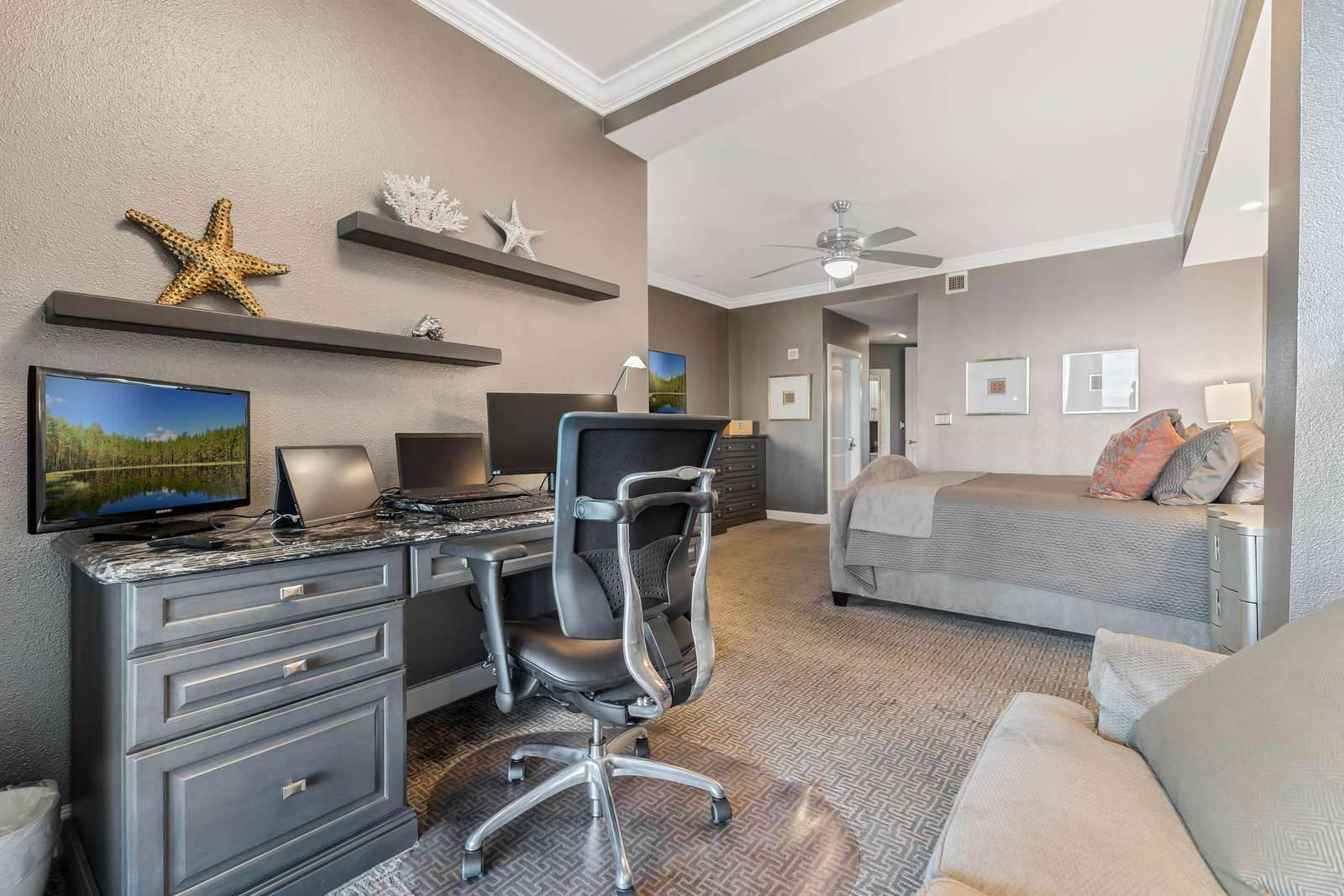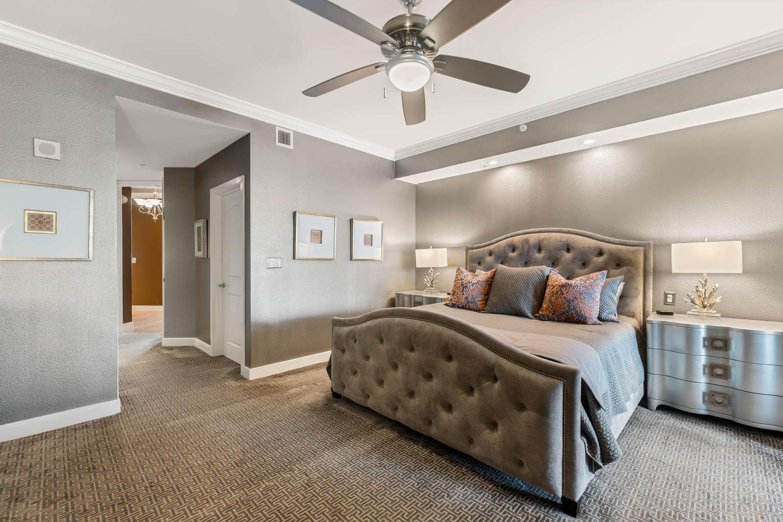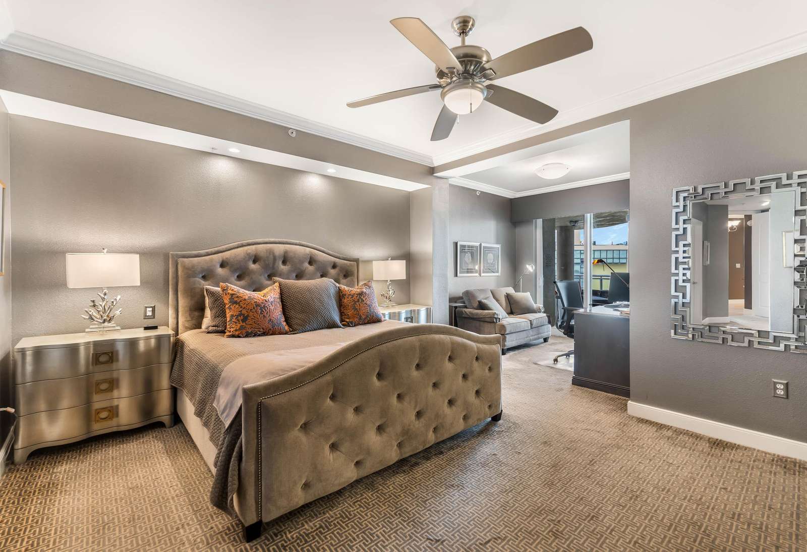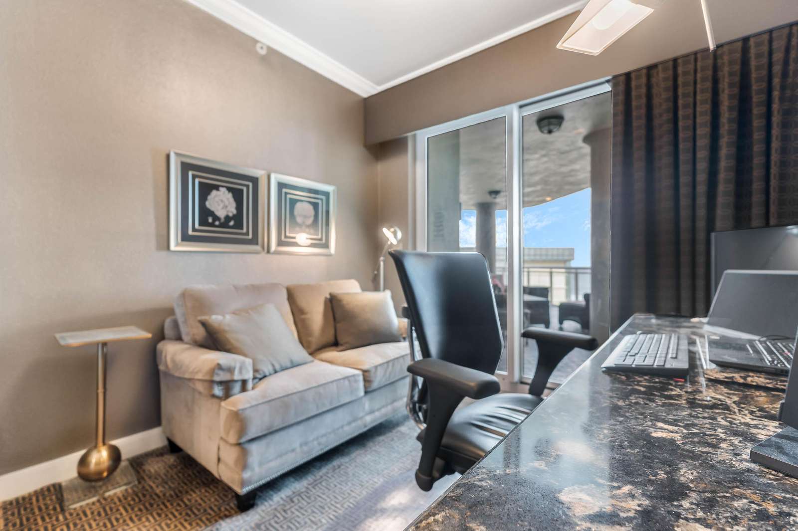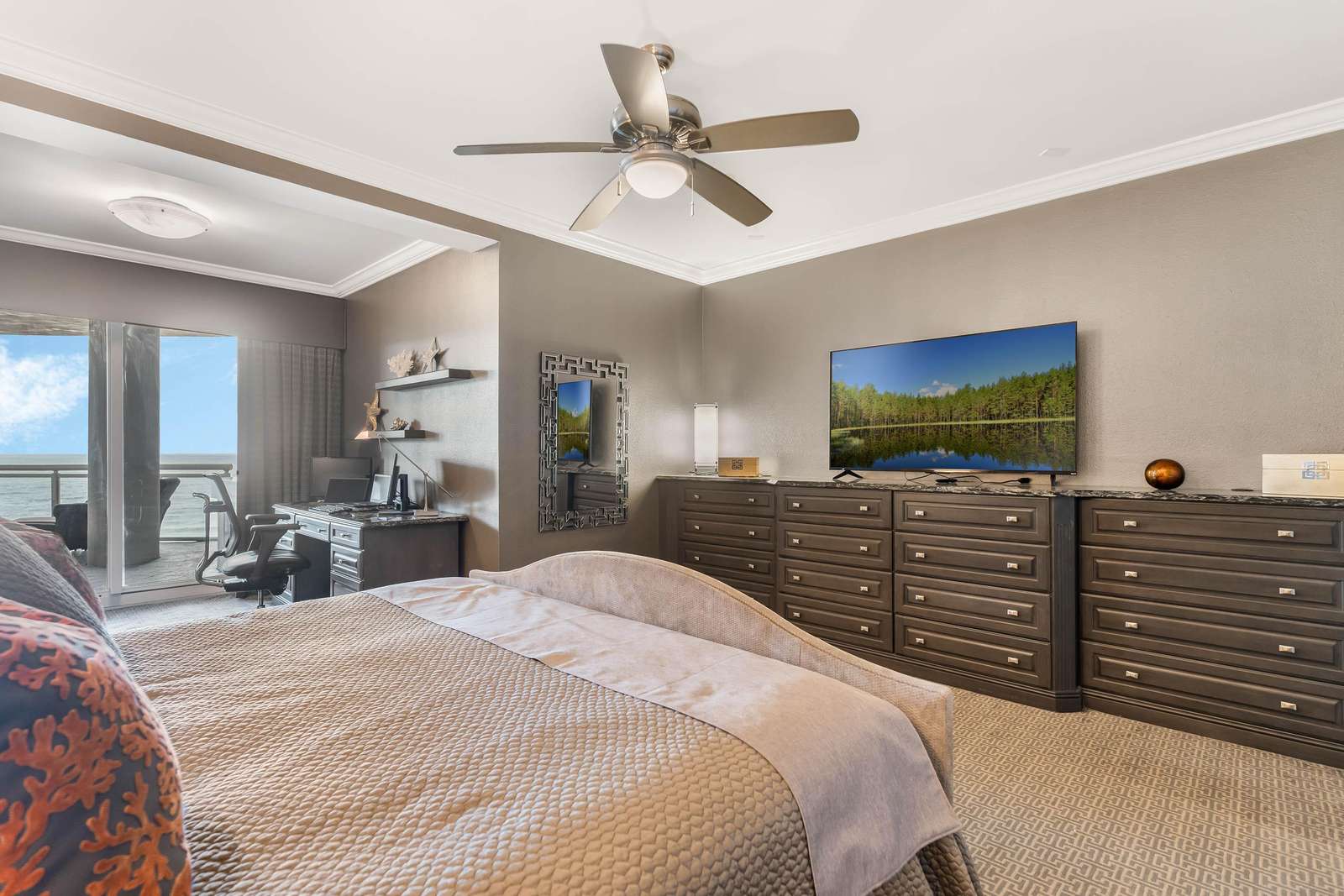 As you walk through the french door entry to your left is a small half bath powder room and to your right the elegantly designed master bedroom with customized furniture, king bed, office desk, a large smart tv with cable, and his/her walk in closets with complete closet organization systems. Attached to the master bedroom is a private balcony entrance and exit as well as a private master bathroom that Is complete with his/her vanities, a large all in shower, and a garden tub.
