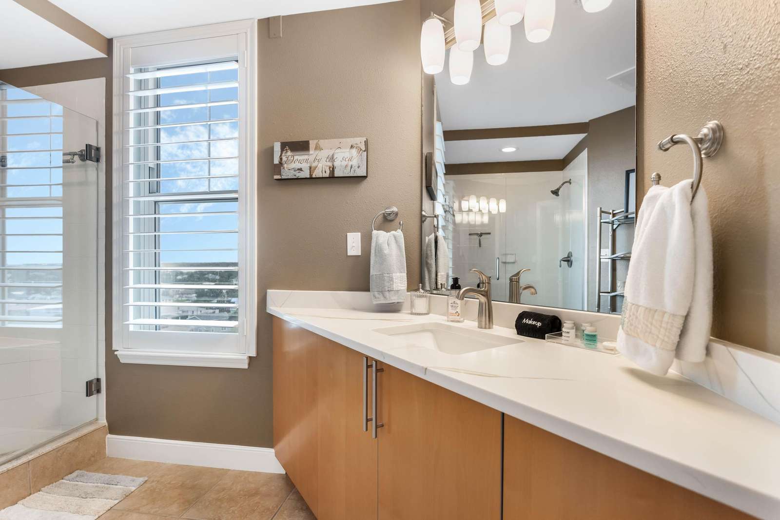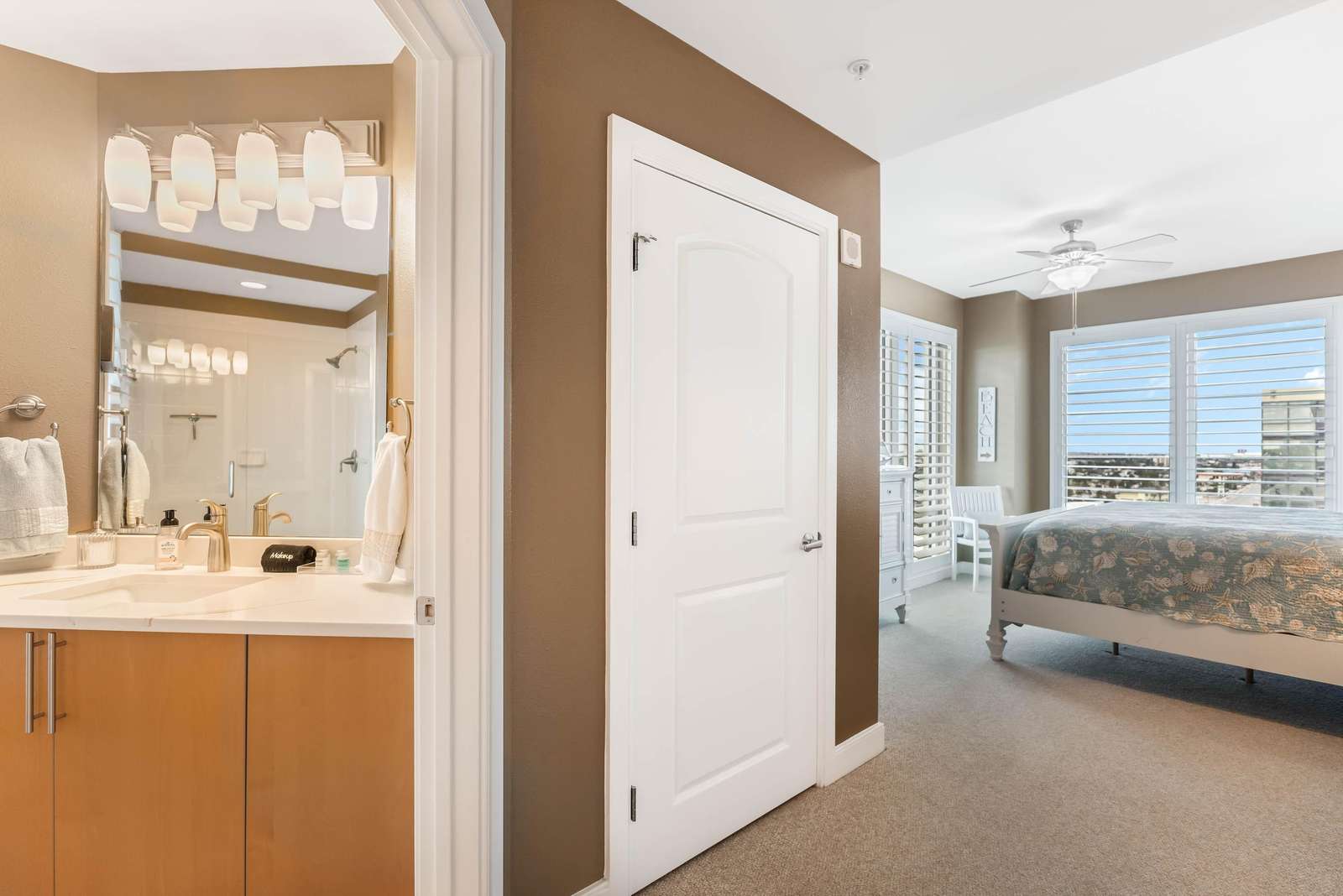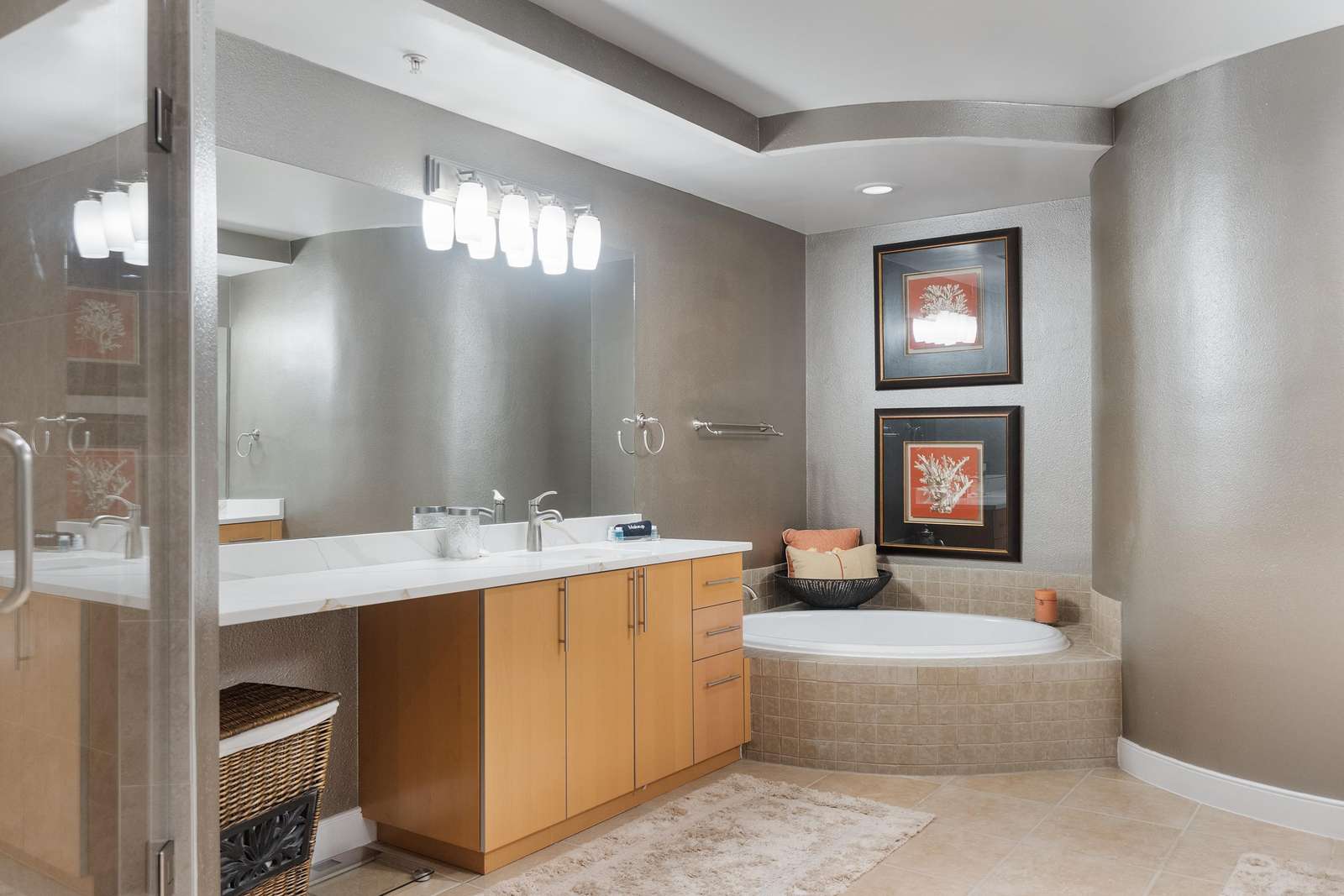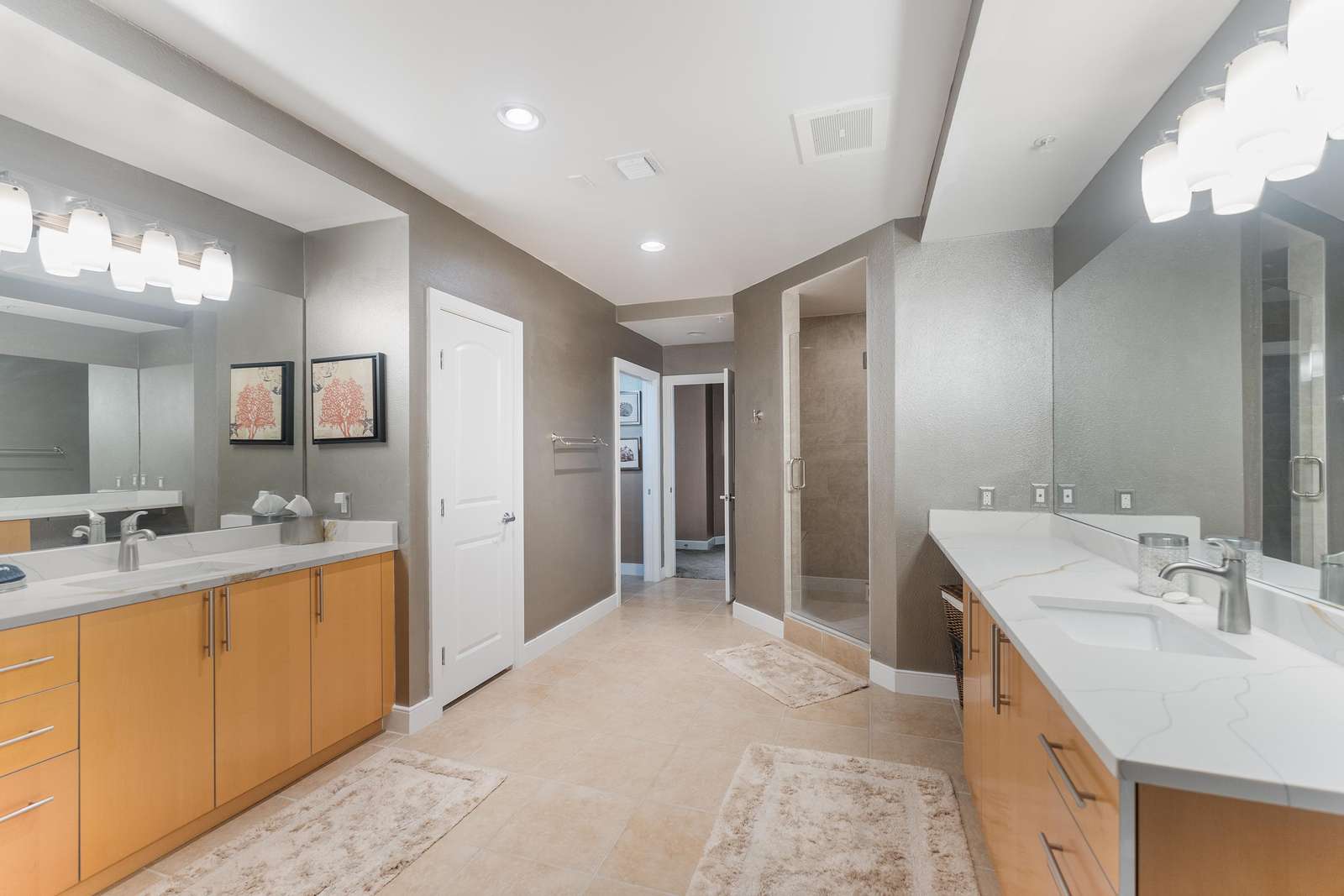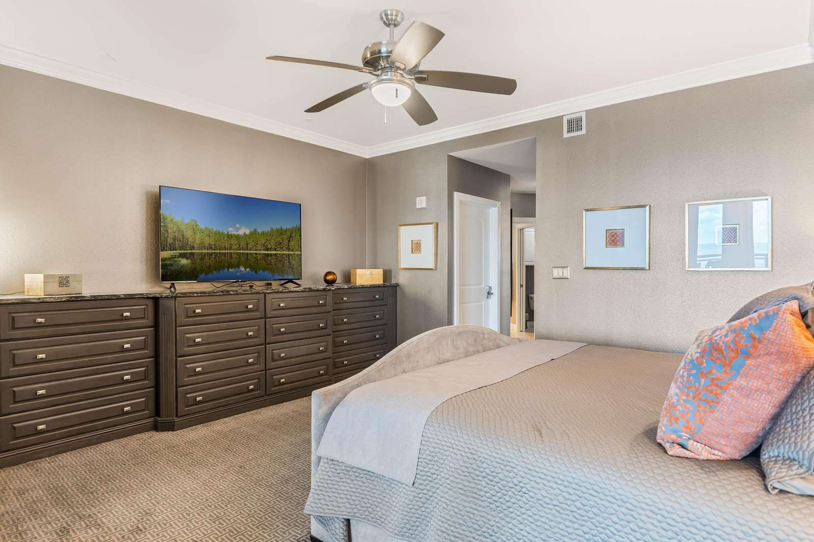 As you walk through the french door entry to your left is a small half bath powder room and to your right the elegantly designed master bedroom with customized furniture, king bed, office desk, a large smart tv with cable, and his/her walk in closets with complete closet organization systems. Attached to the master bedroom is a private balcony entrance and exit as well as a private master bathroom that Is complete with his/her vanities, a large all in shower, and a garden tub.