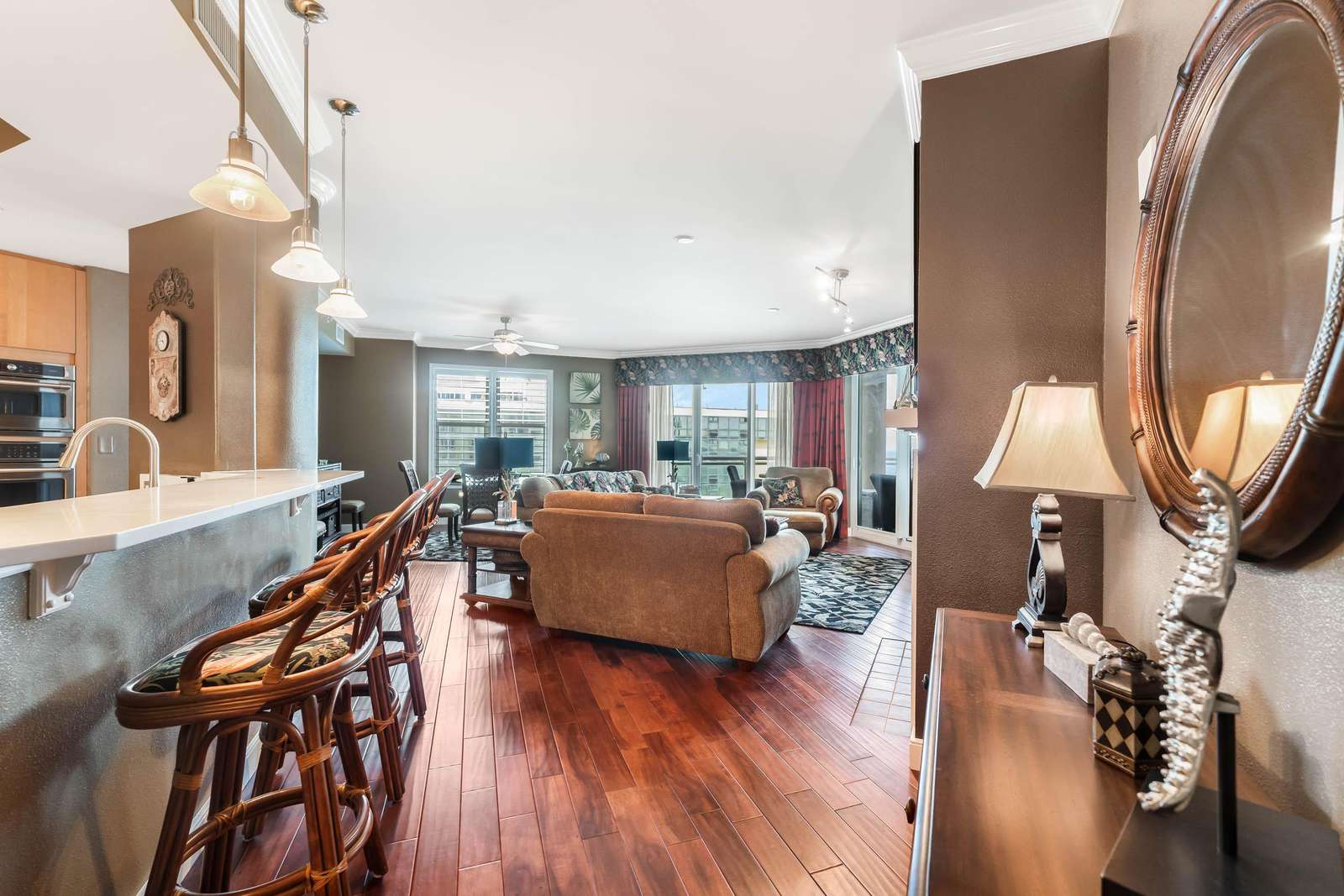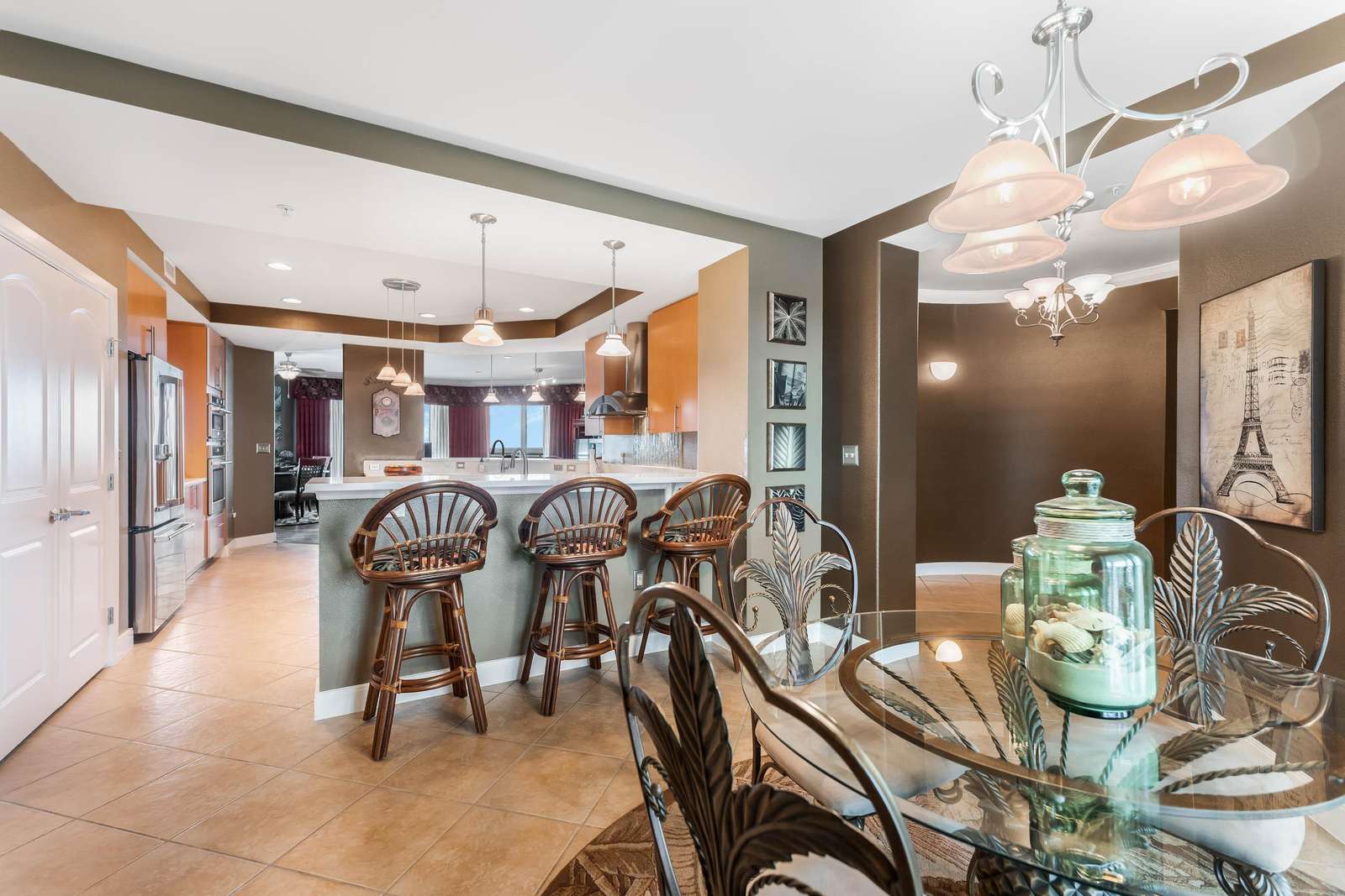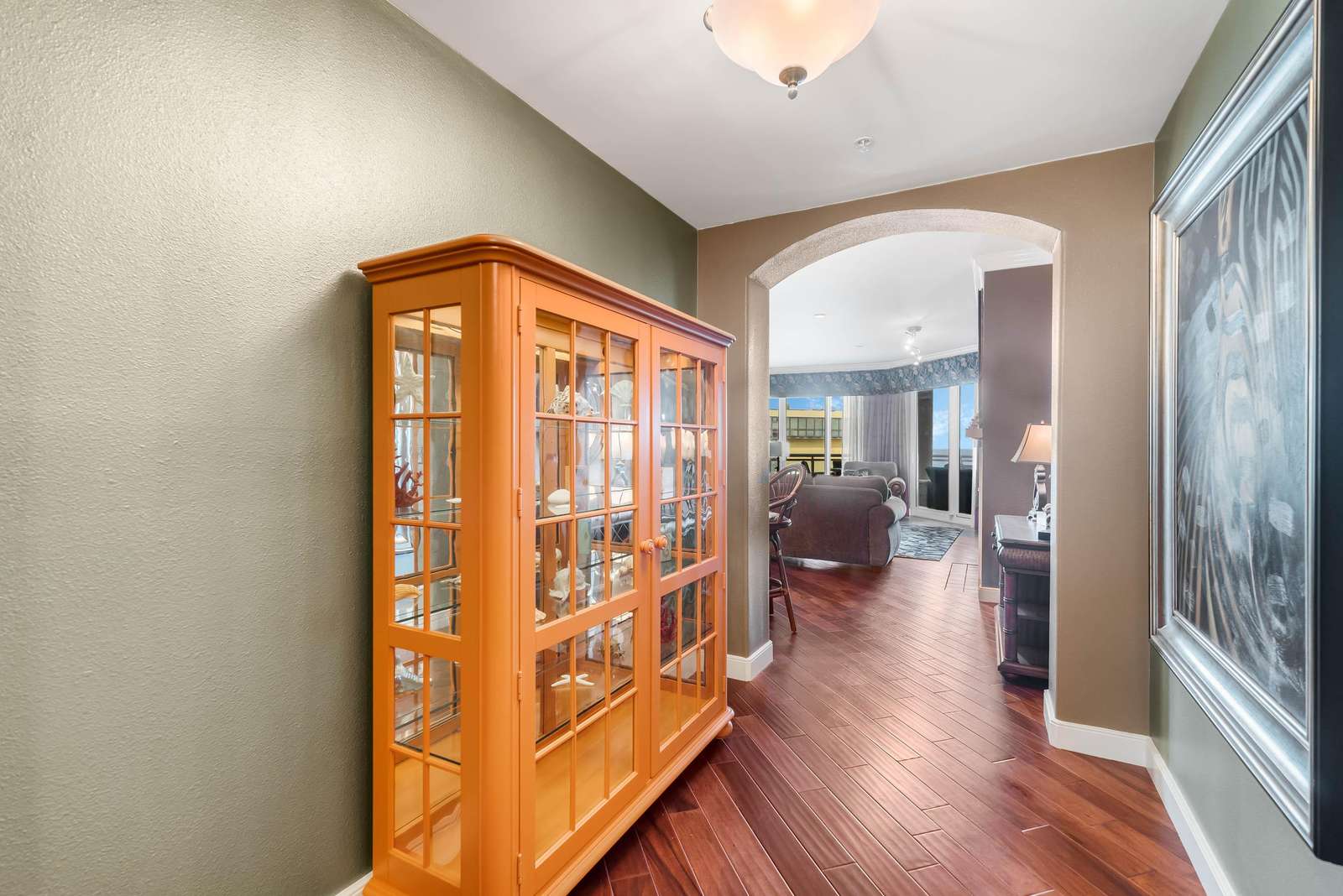 Walking out of the master bedroom takes a right and you will walk underneath a beautiful rotunda ceiling. The floorplan splits here; to your right takes you to the beautifully decorated family room and to your left will take you to the back bedrooms and past a small dining area overlooking the gourmet chef's kitchen and the sunset balcony entrance.
