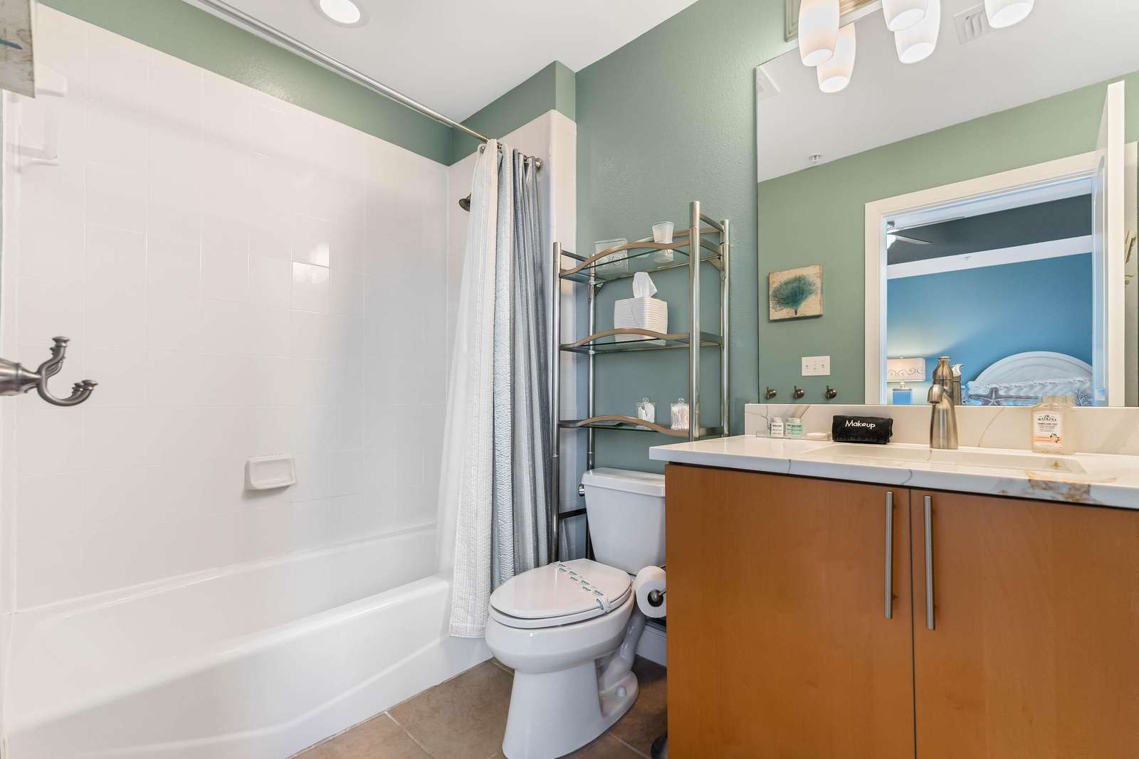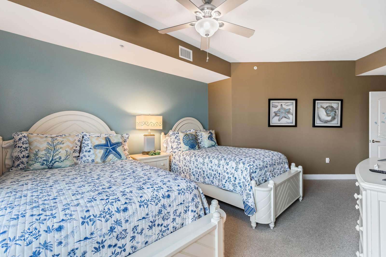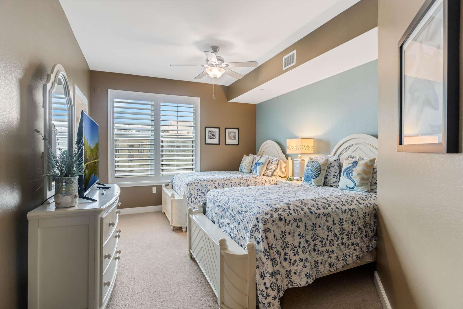 Bedroom #3 is located down the same hall as #2 and inside are two double beds with a smart tv, walk-in closet, dresser, and private bath with a shower/tub combo.