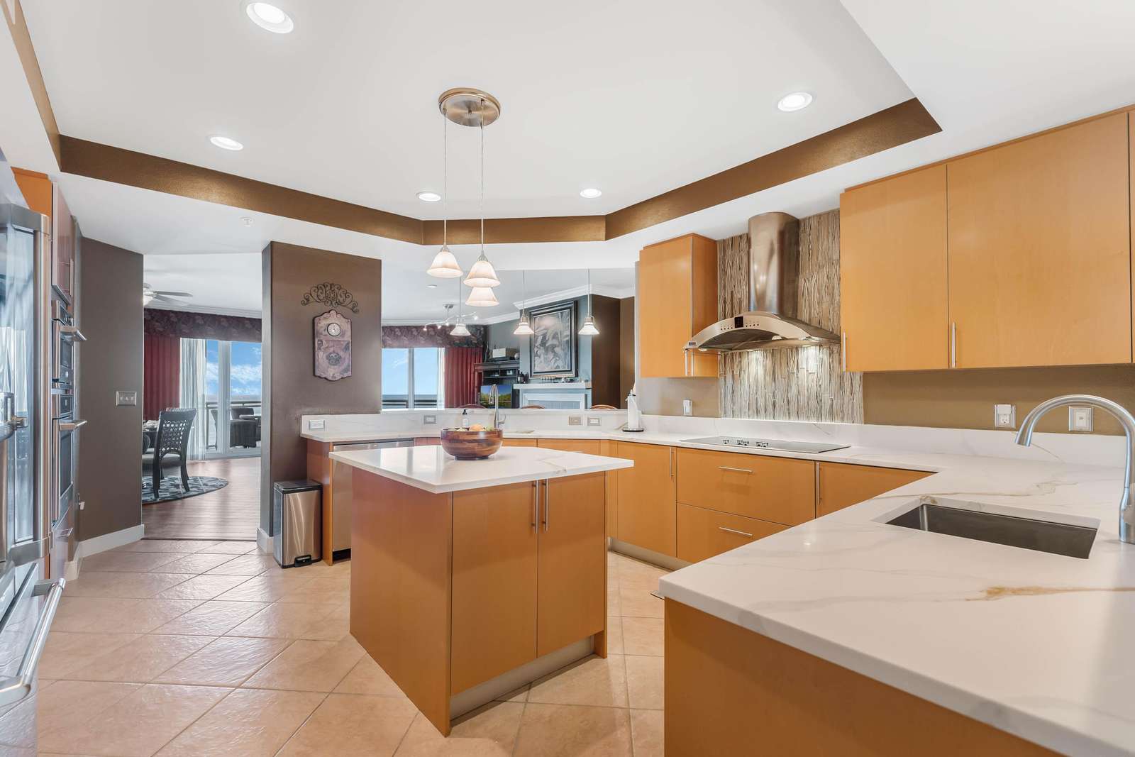 The kitchen is an open floor plan with bar seating on either side. From the kitchen you can overlook the gorgeous family room as well as a picture perfect view of the ocean through the floor to ceiling sliding glass door/windows. The family room features another small dining area as well as a large couch with two chairs situated around a smart tv with an awesome view of the ocean from every angle.