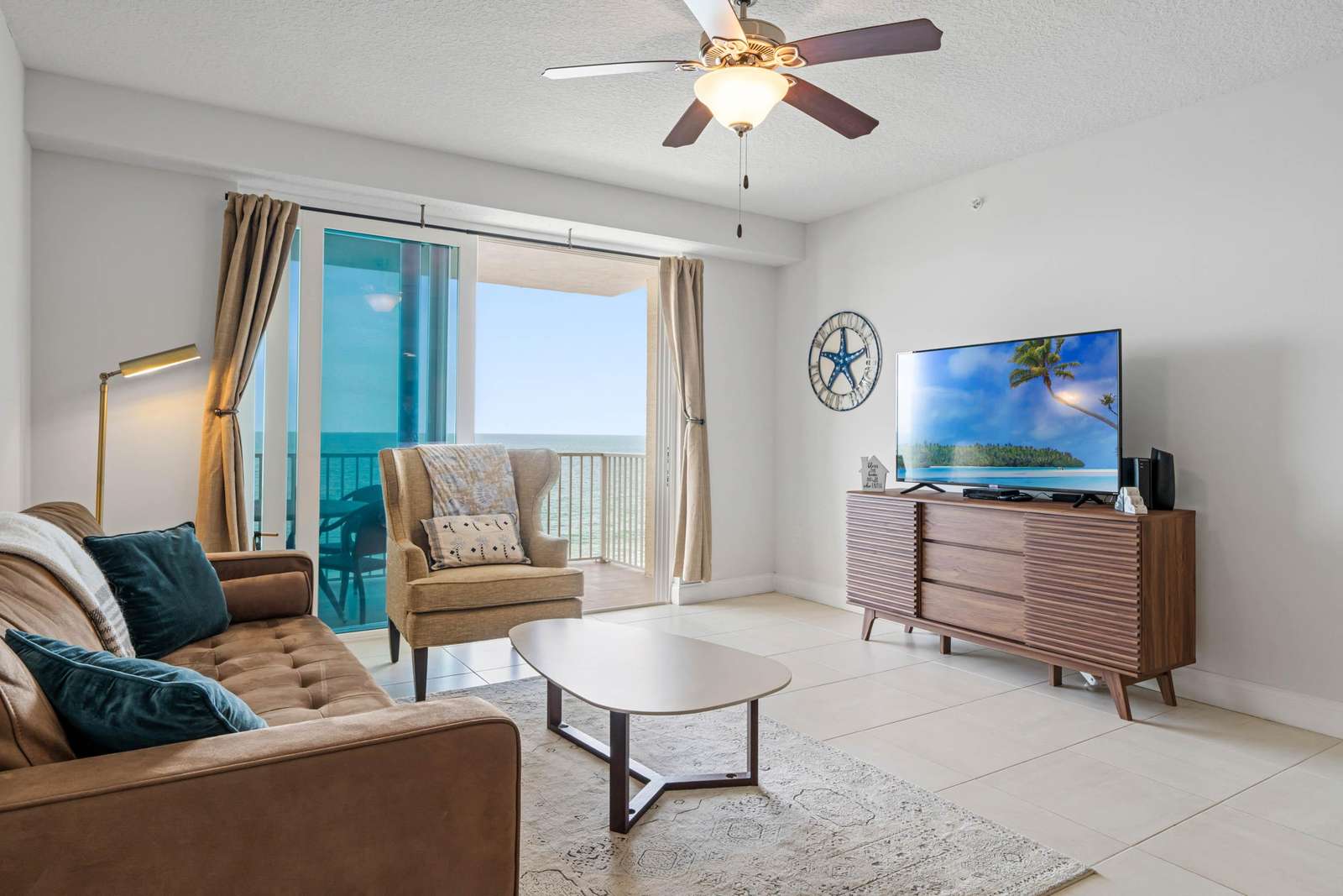 ~ Oceanfront Living Room: Relax on a cozy sofa with two accent chairs, all oriented for the perfect view of the large Smart TV and the endless ocean horizon.