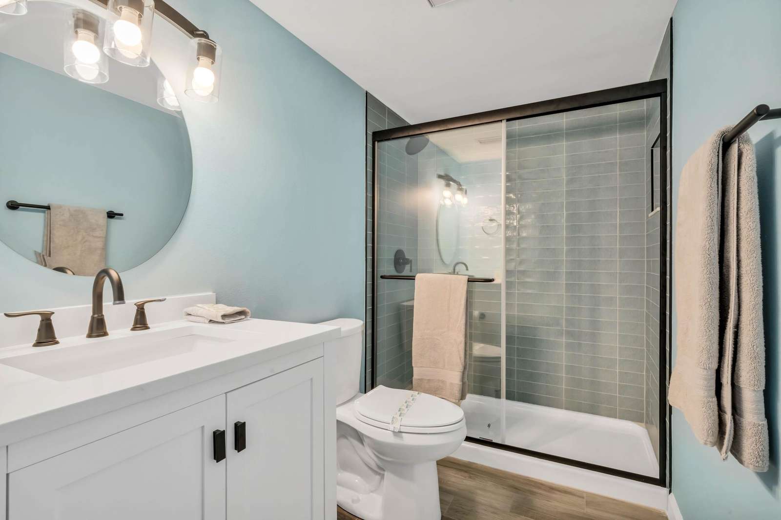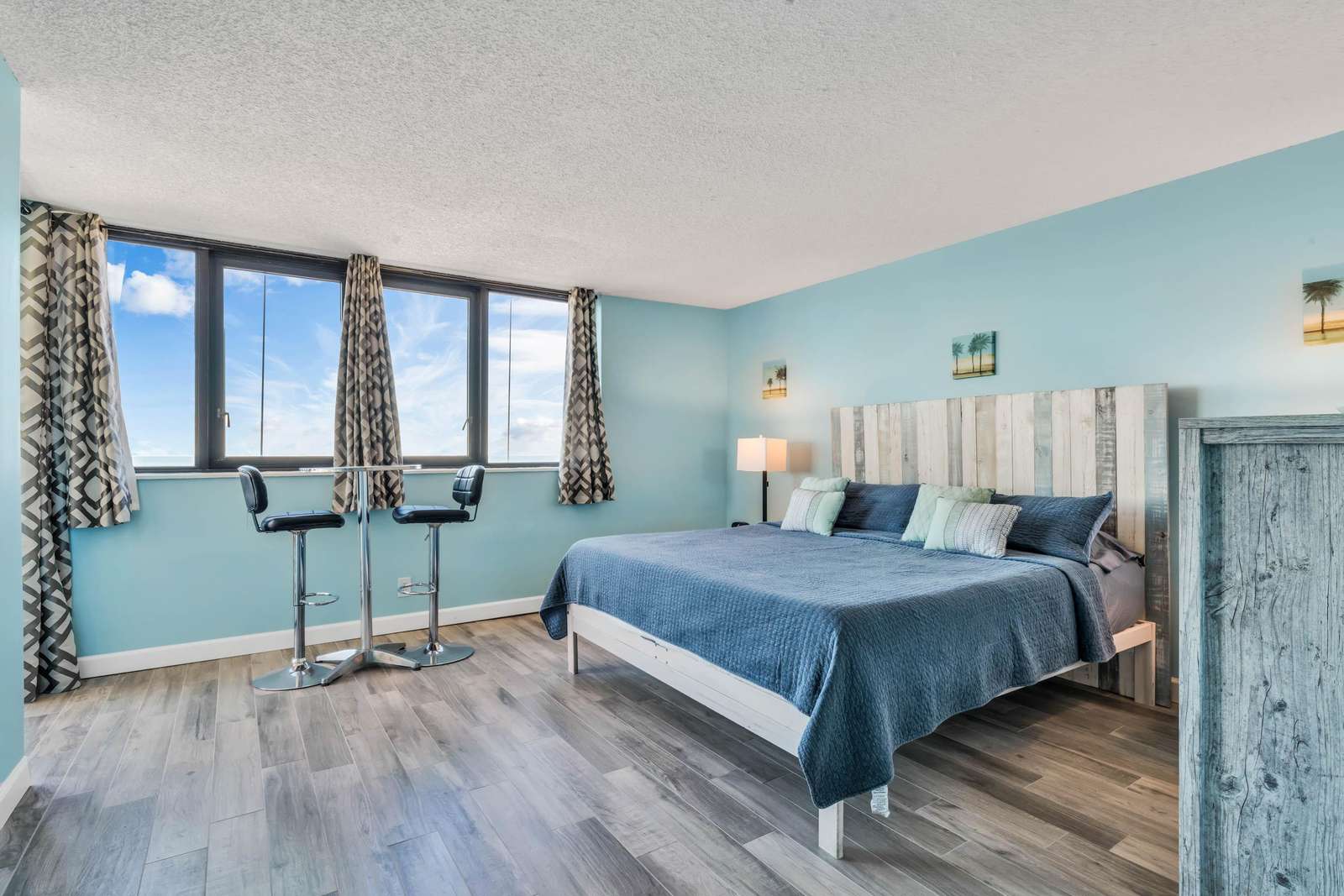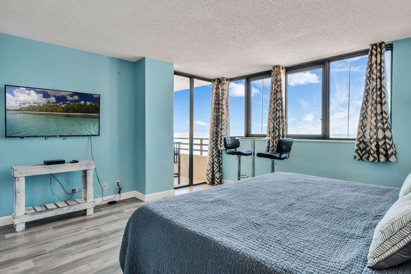 The master suite features a king size memory foam bed, a panoramic window view of the ocean, and direct balcony access. The master bathroom features a his/her double sink vanity with a gorgeously remodeled walk in shower.