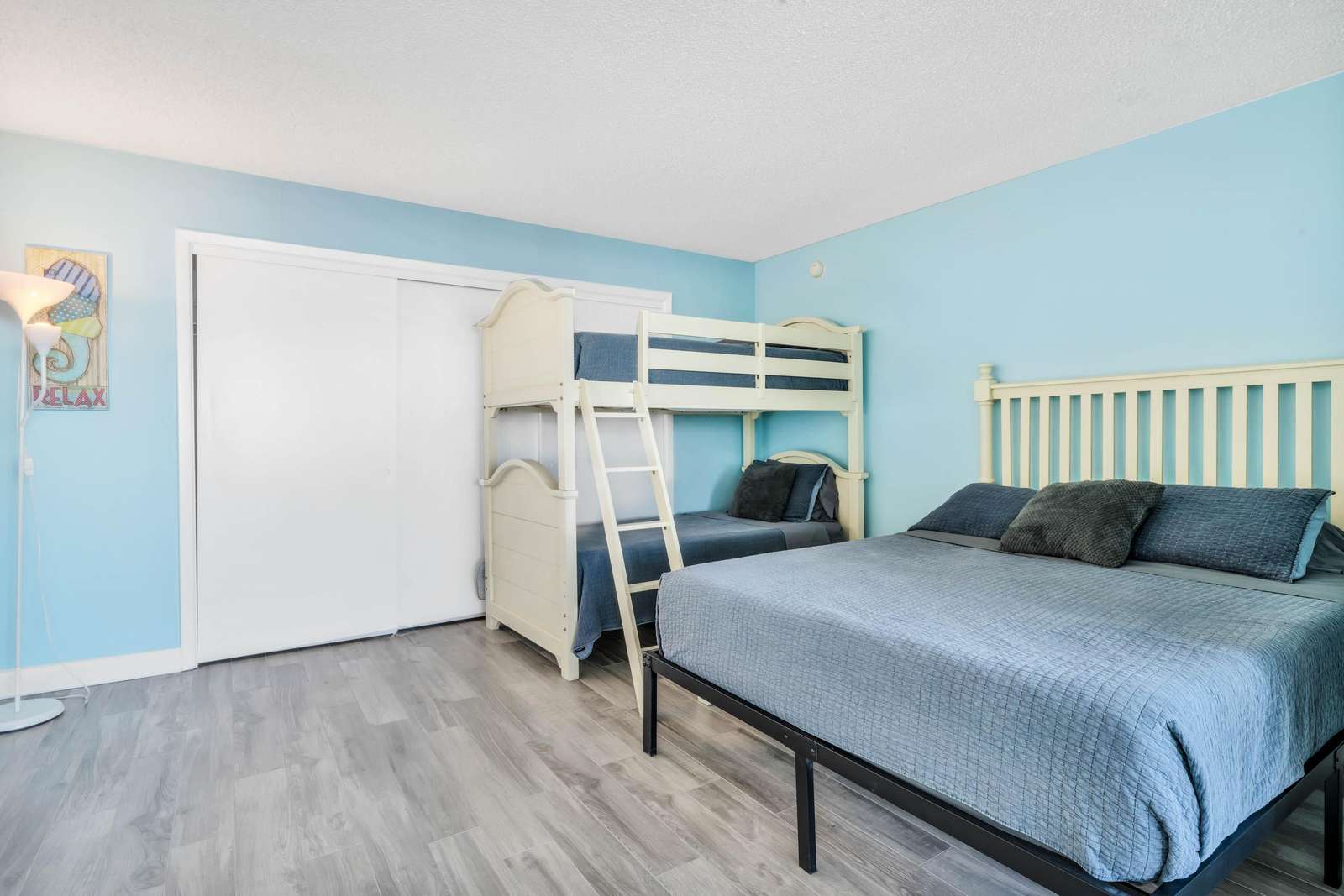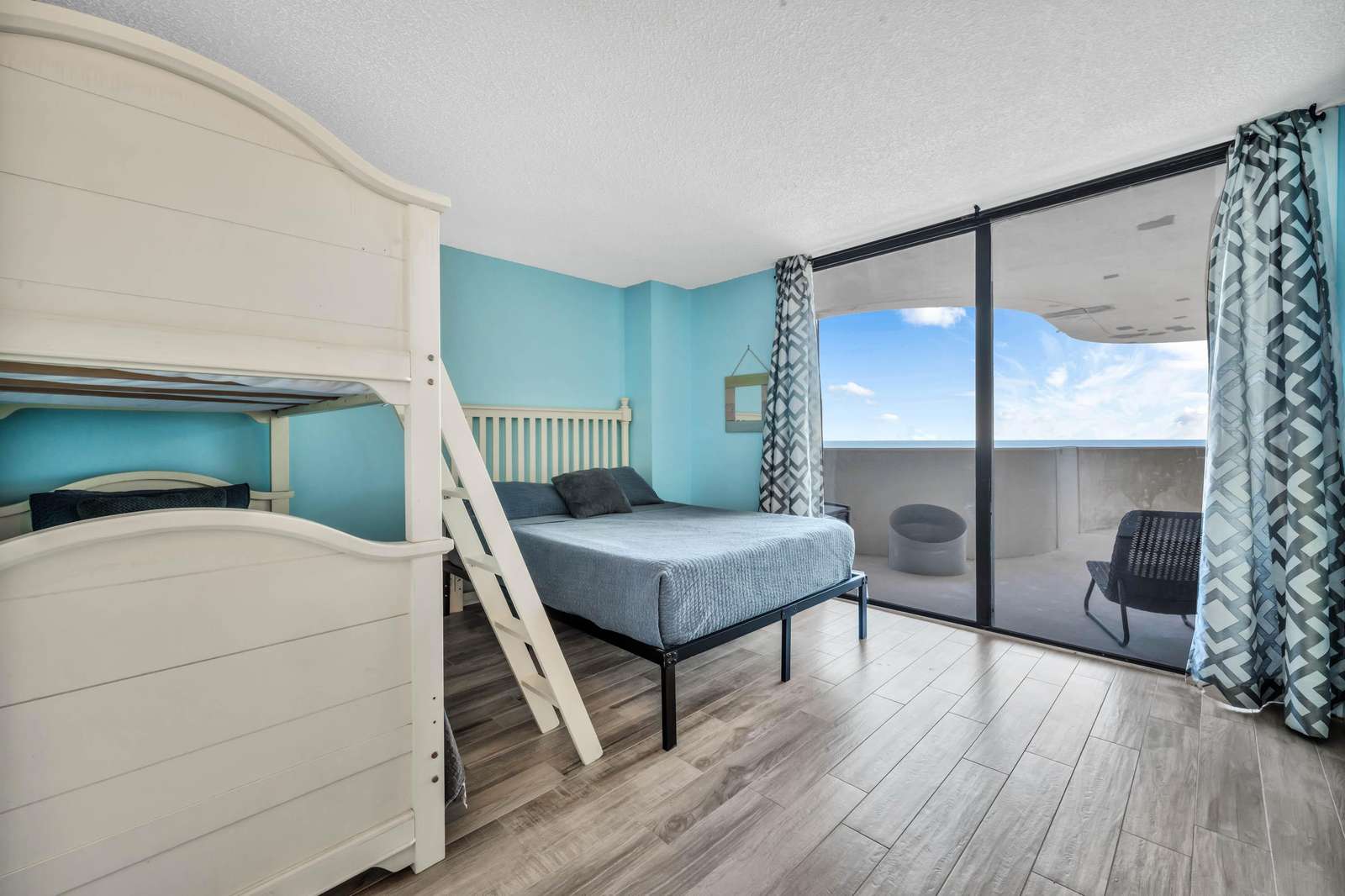 The second bedroom features a twin over full bunk bed, next to an individual queen bed with direct balcony access. The second bathroom is located across the hall from this room and features a single vanity/sink with a gorgeously renovated walk in shower.