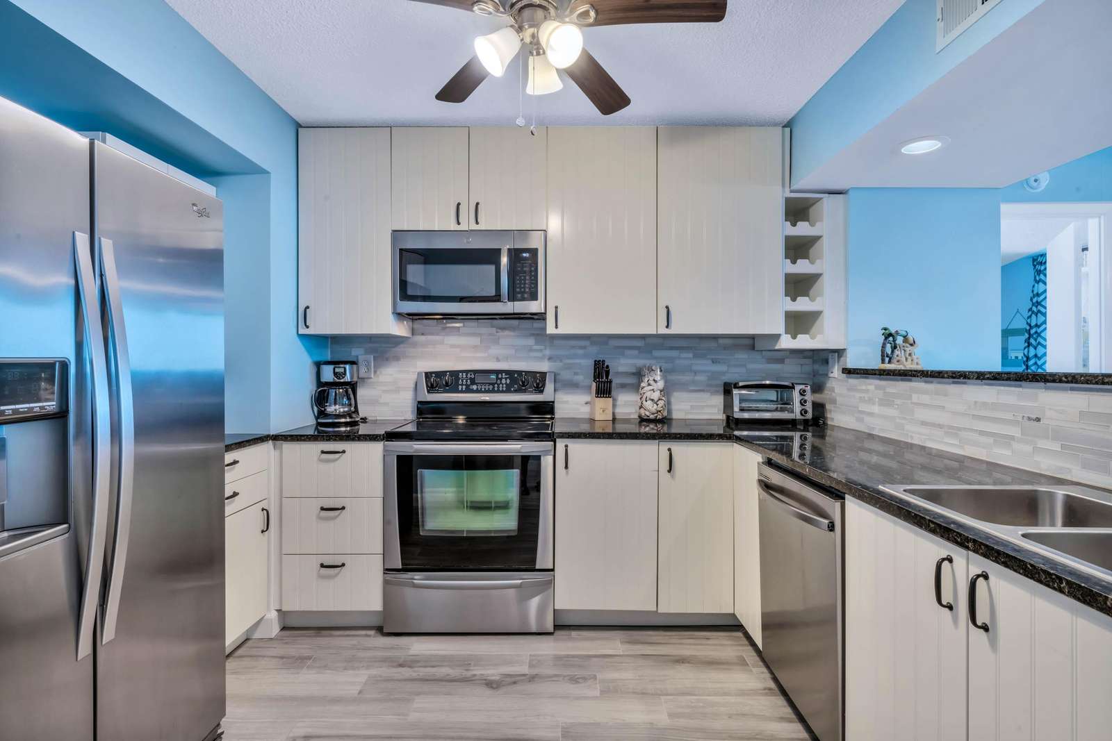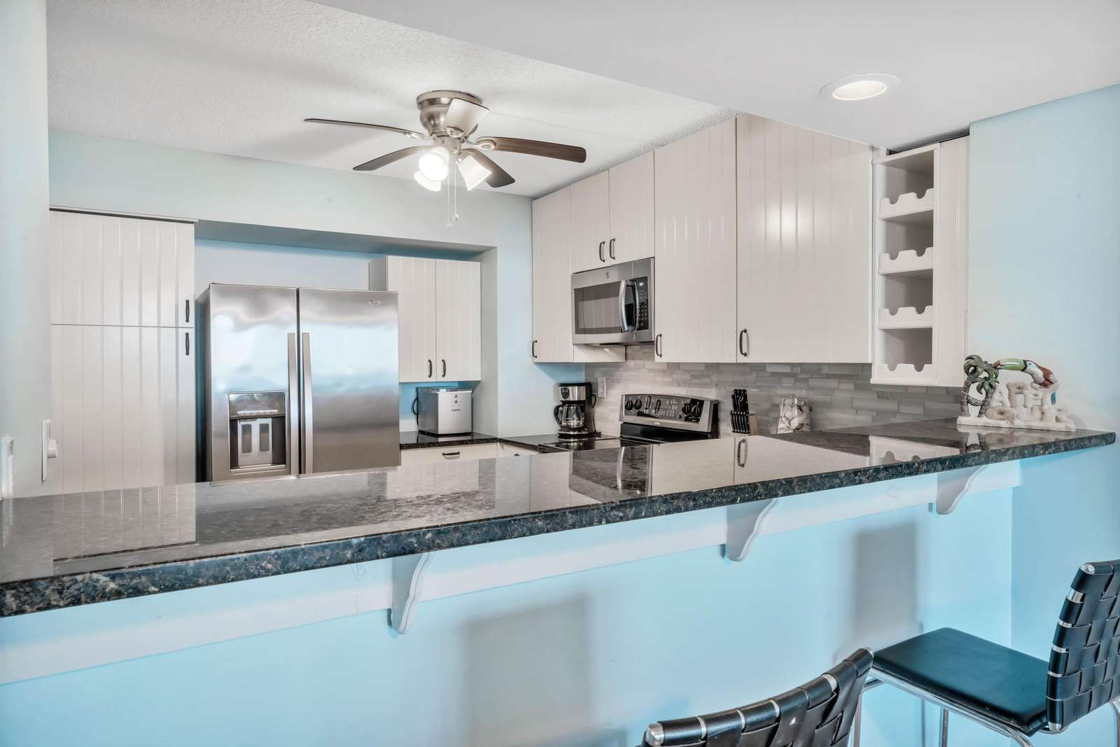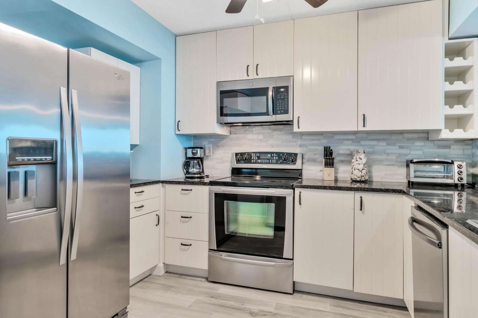 The kitchen has been renovated and features stunning white cabinets, beautiful black granite countertops, and the backdrop of stainless steel appliances.