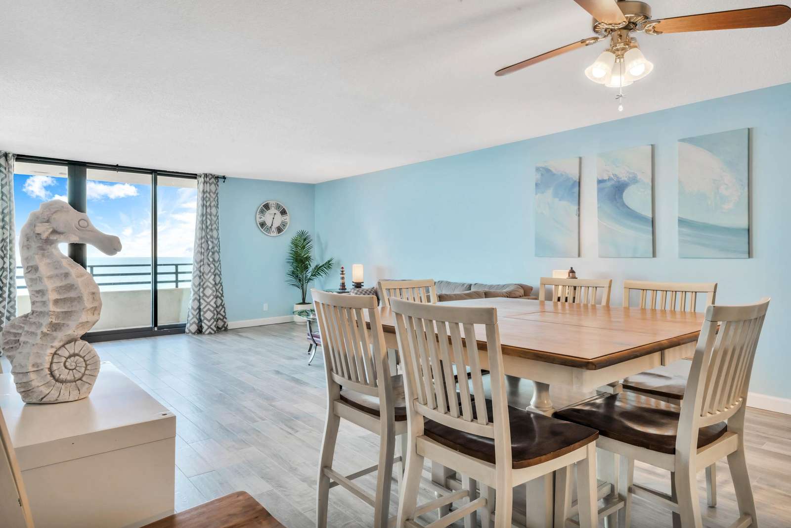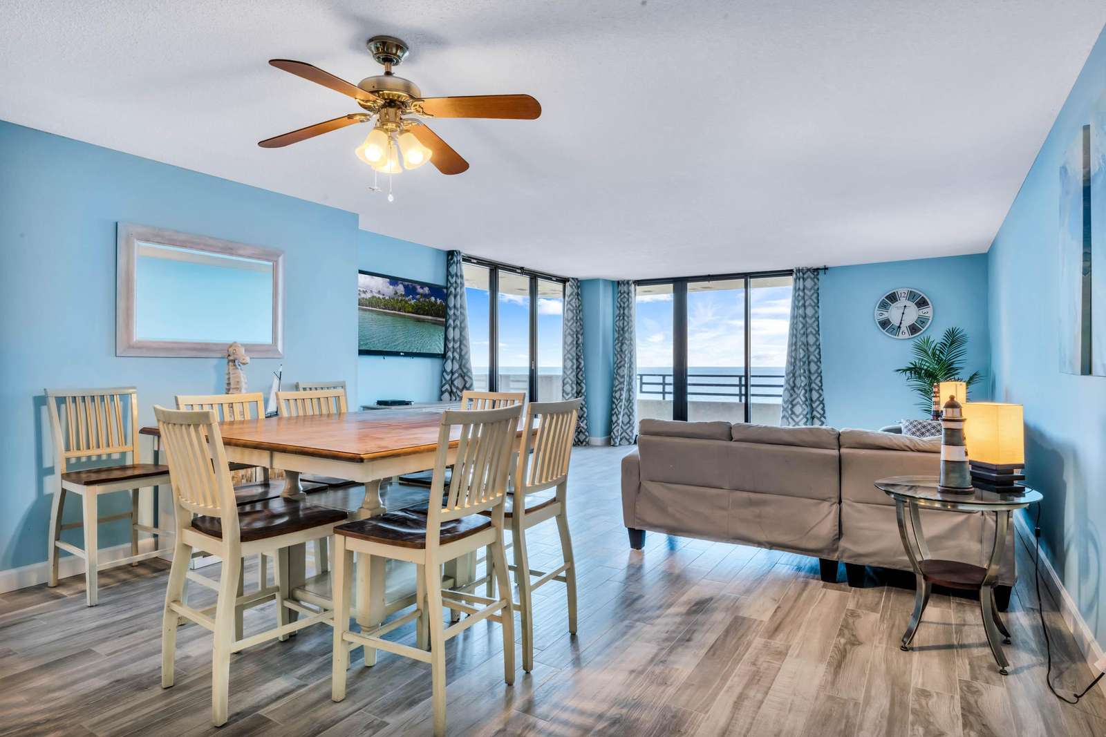 The living room includes a nice sectional overlooking the floor to ceiling oceanfront windows as well as a wall mounted 65" Samsung 3D TV. There is a a sliding glass door to go out on the wrap around balcony.